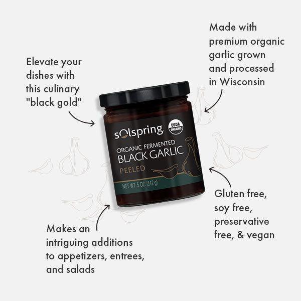 Solspring® Organic Fermented Peeled Black Garlic is made with premium organic garlic grown and processed in Wisconsin. . Our unique, eco-friendly fermentation process includes an extensive aging period of at least 120 days, which enhances the sweetness, deepens the flavor and darkens the color. It makes an intriguing addition to appetizers, entrees, sides, salads, and desserts. Here are just a few ideas: