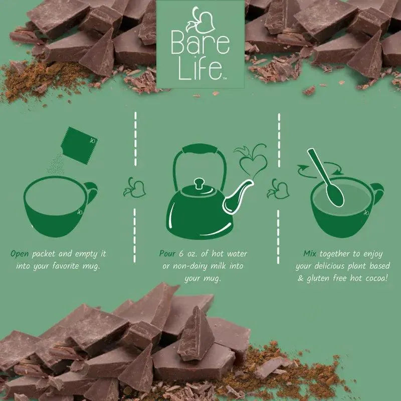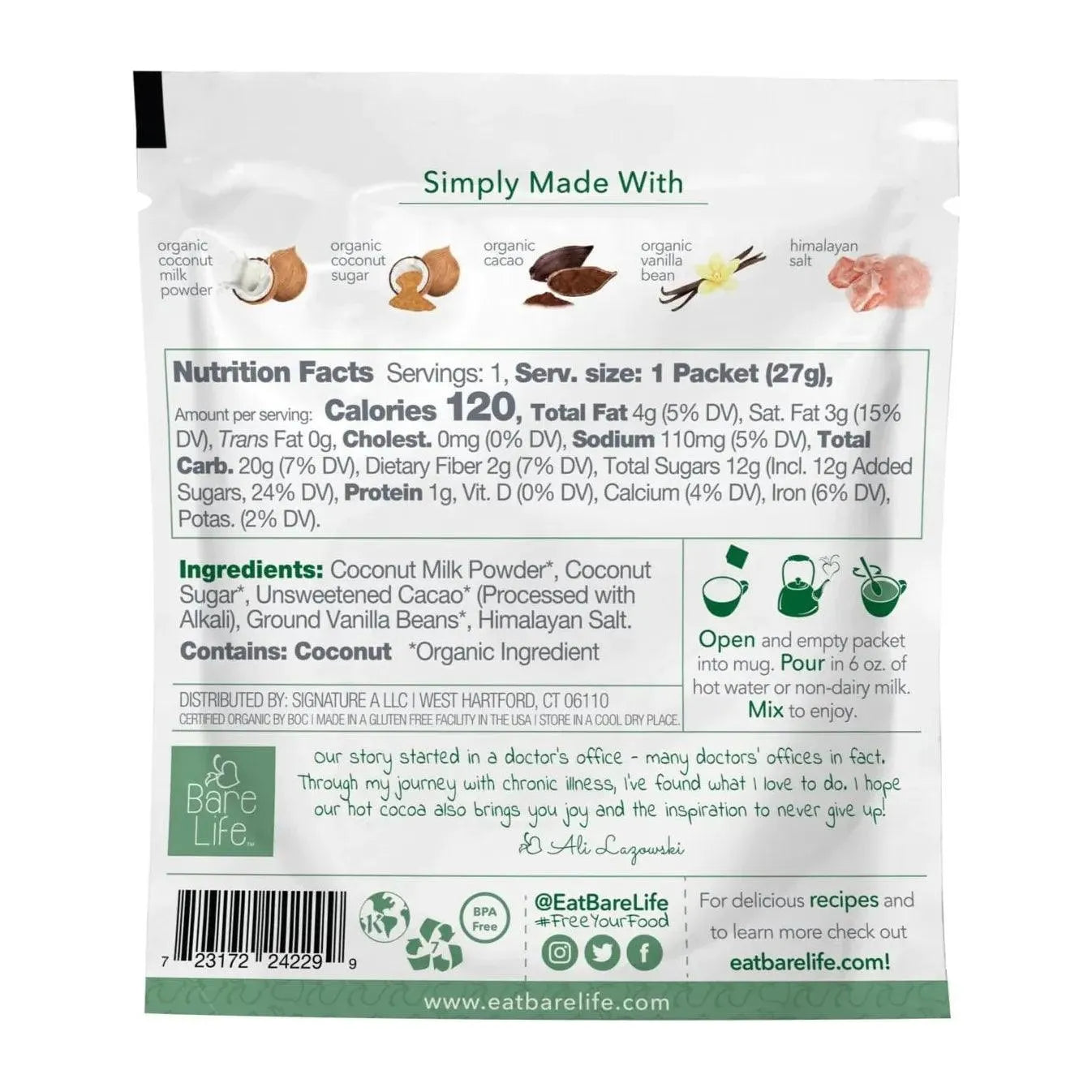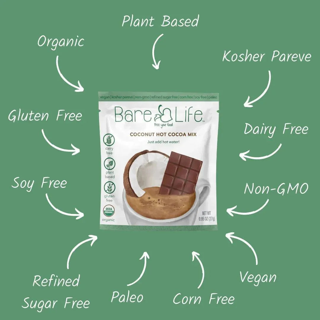Organic Hot Cocoa (dairy-free) from Bare Life is a deliciously rich coconut hot cocoa mix with 5 simply natural ingredients that are allergen friendly and are sustainably sourced from socially conscious and fair-trade friendly producers and made in an organic, kosher and gluten free facility in New England.