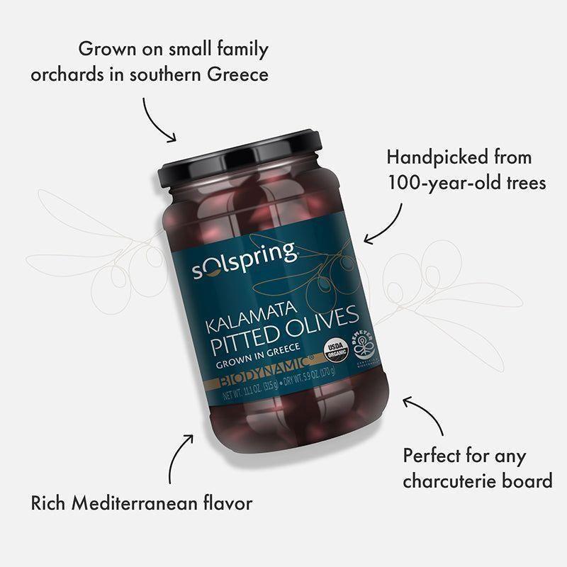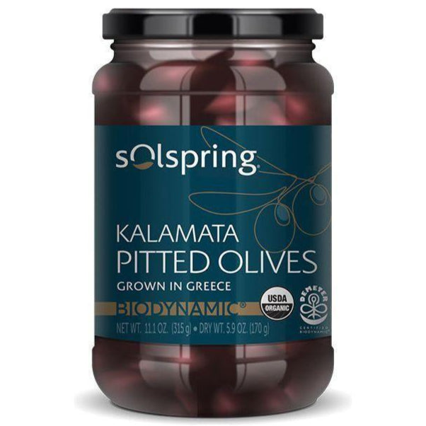 Solspring® Kalamata Pitted Olives, Biodynamic® Organic. Demeter Certified Biodynamic® agriculture is a step up from organic standards in that it considers the entire farm instead of individual crops and products. It requires the use of holistic regenerative farming practices to promote the health of the soil, crops livestock.