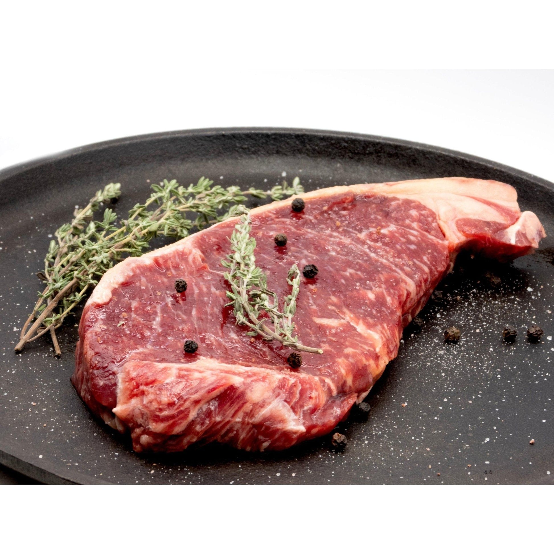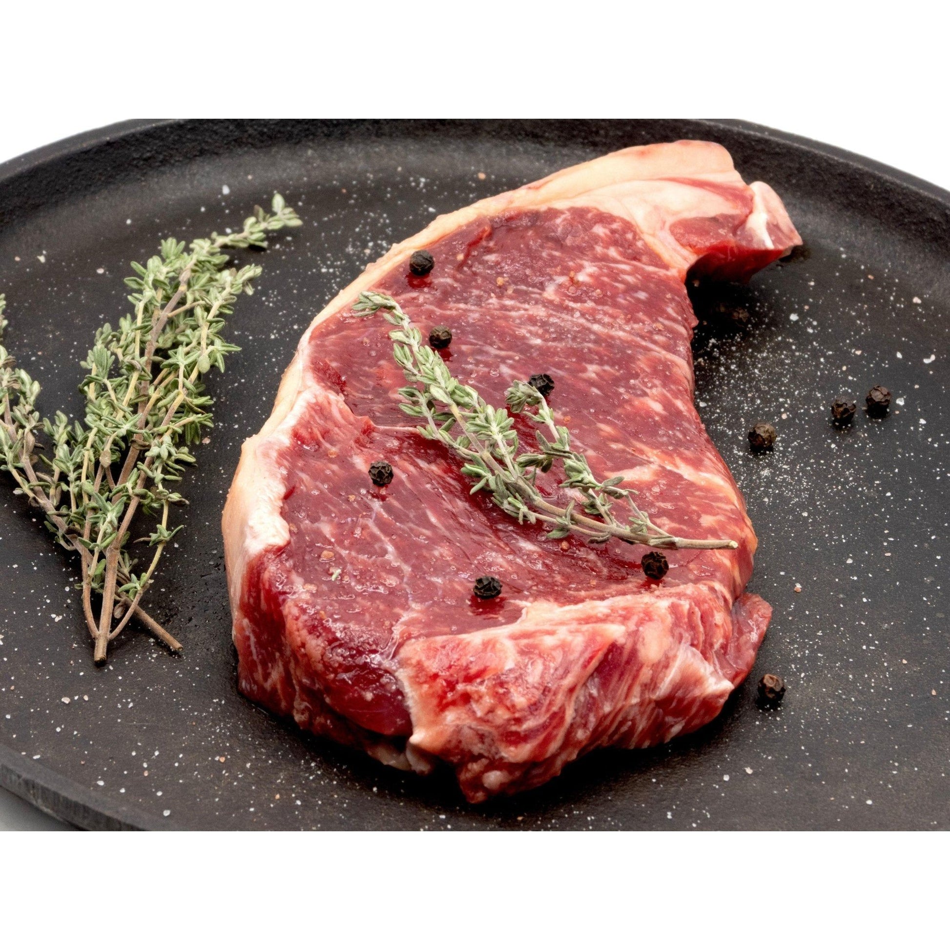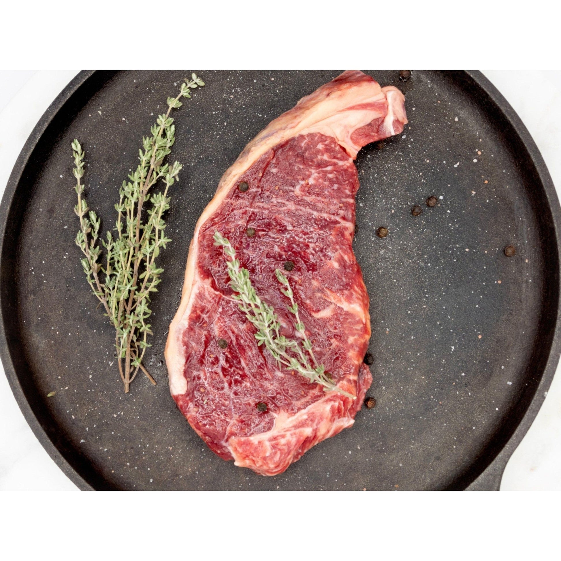 Akaushi Wagyu Beef Striploin Steak (aka NY Strip) is a cut from the short loin and is finely textured, tender, and juicy. One of the more popular steak cuts, its signature buttery flavor and moderate marbling make it an excellent, less fatty steak choice.